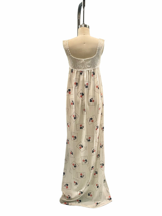 1970s White Crocheted Bodice Nylon Floral Print Boho Maxi Dress