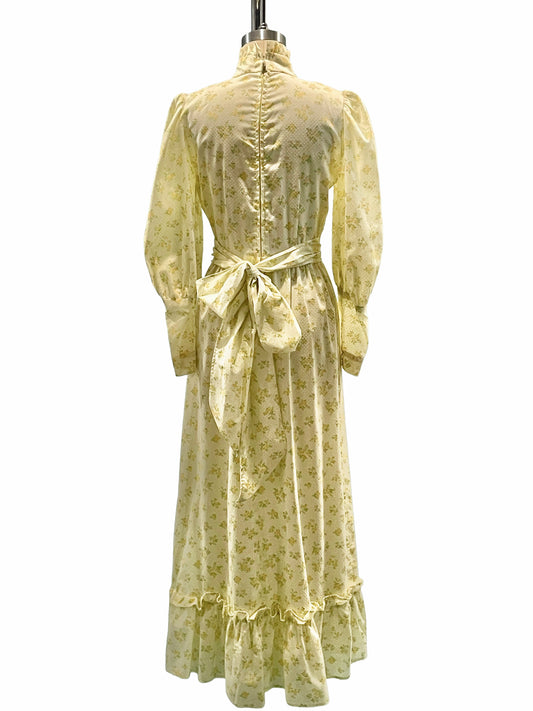 1970s Pale Yellow Floral Swiss Dot Ruffle Prairie Dress