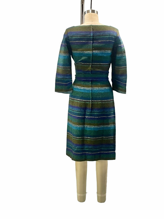 1960s Blue Green Wool Stripe Square Neckline Belted Wiggle Dress