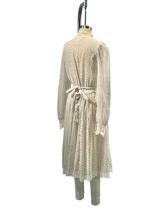 1970s Cream Calico Gunne Sax Jessica McClintock Lace Trim Prairie Dress