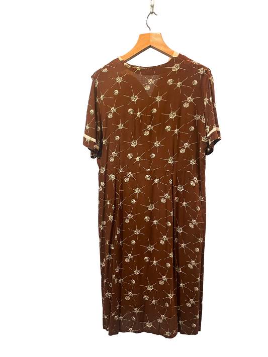 1950s Brown Atomic Geometric Print Rayon Plus-Size House Dress
