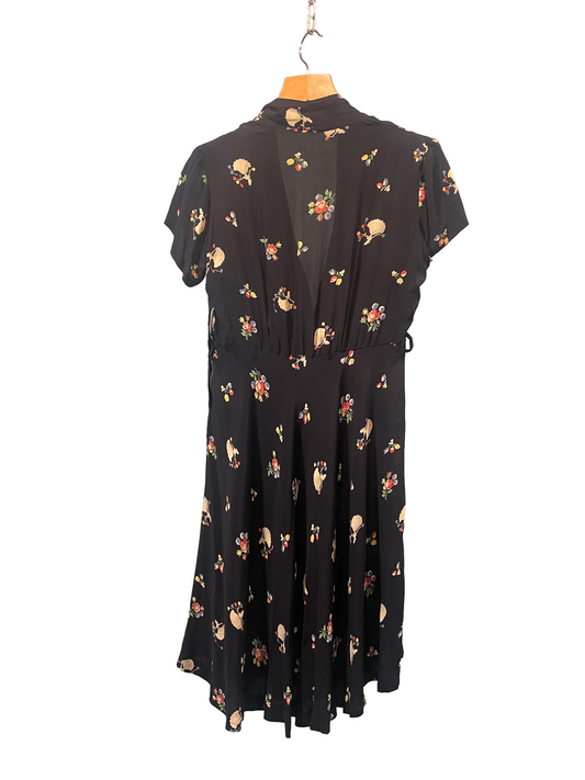 1940s Navy Vivid Abstract Print Rayon Fruits Button Plus-Size Dress