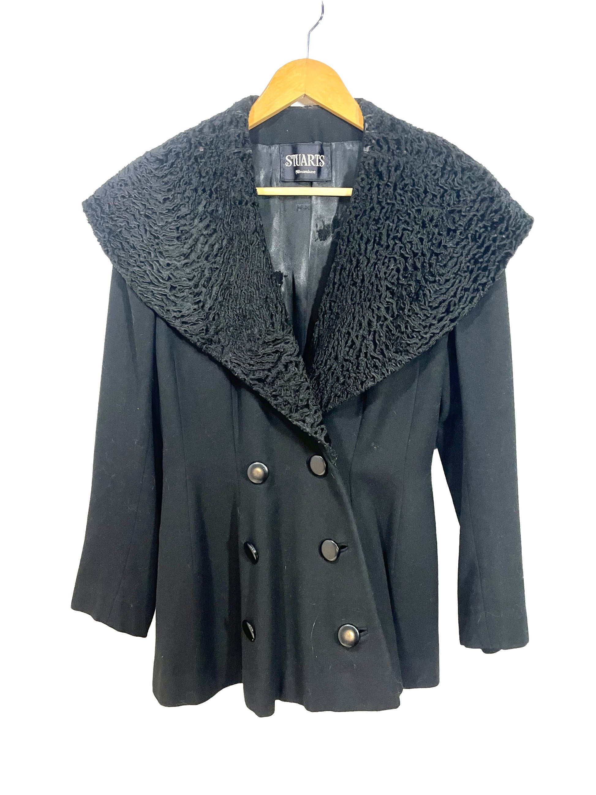 1950s Black Wool Felt Wide Lambs Fur Collar Fit & Flare Coat