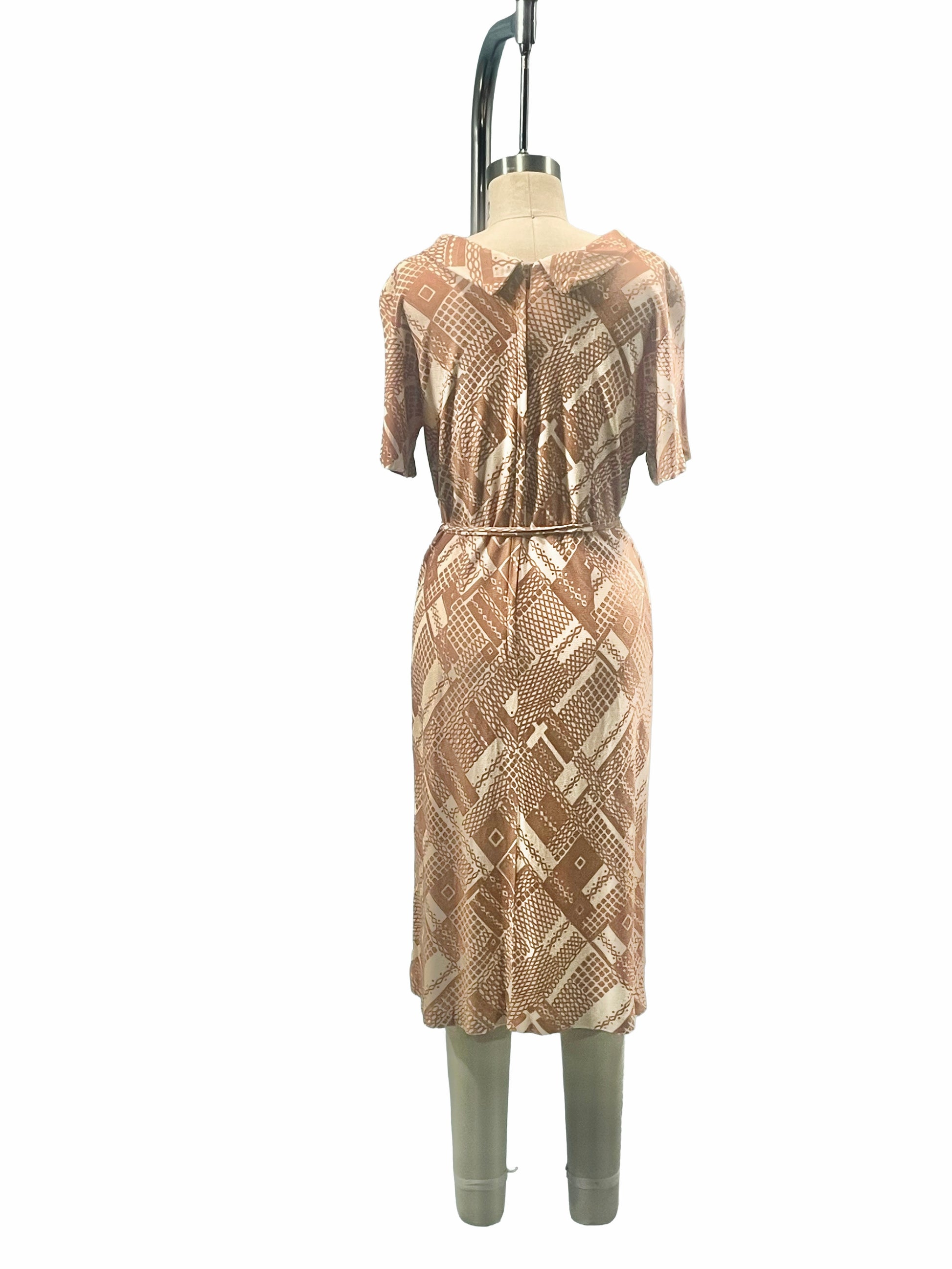 1960s Mocha Cream Geo Print Slinky Nylon Double-Tie Belt Dress