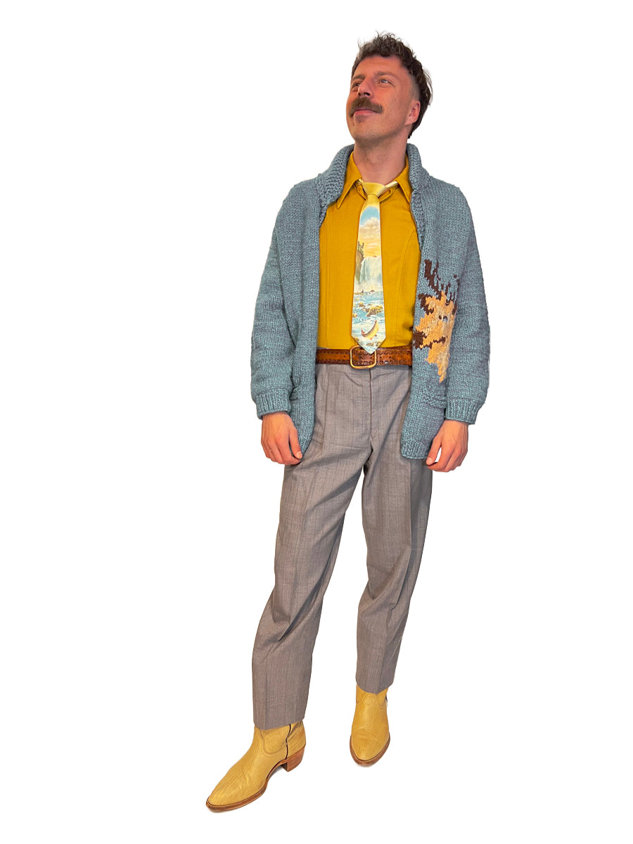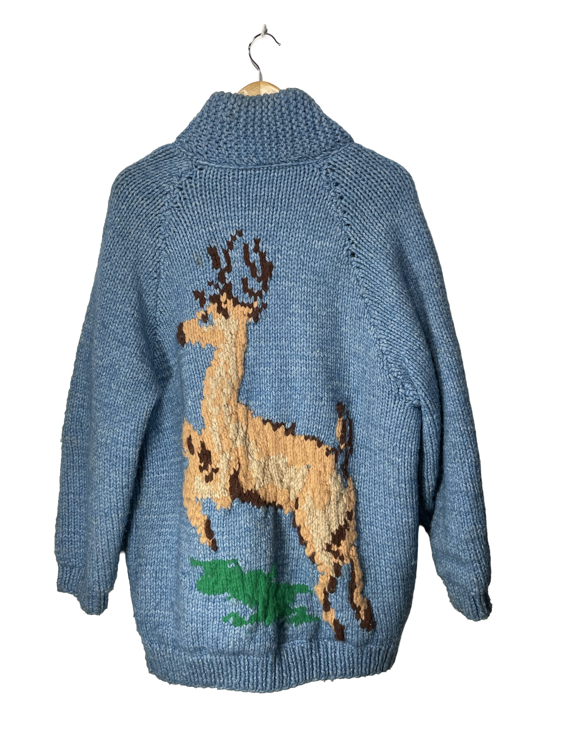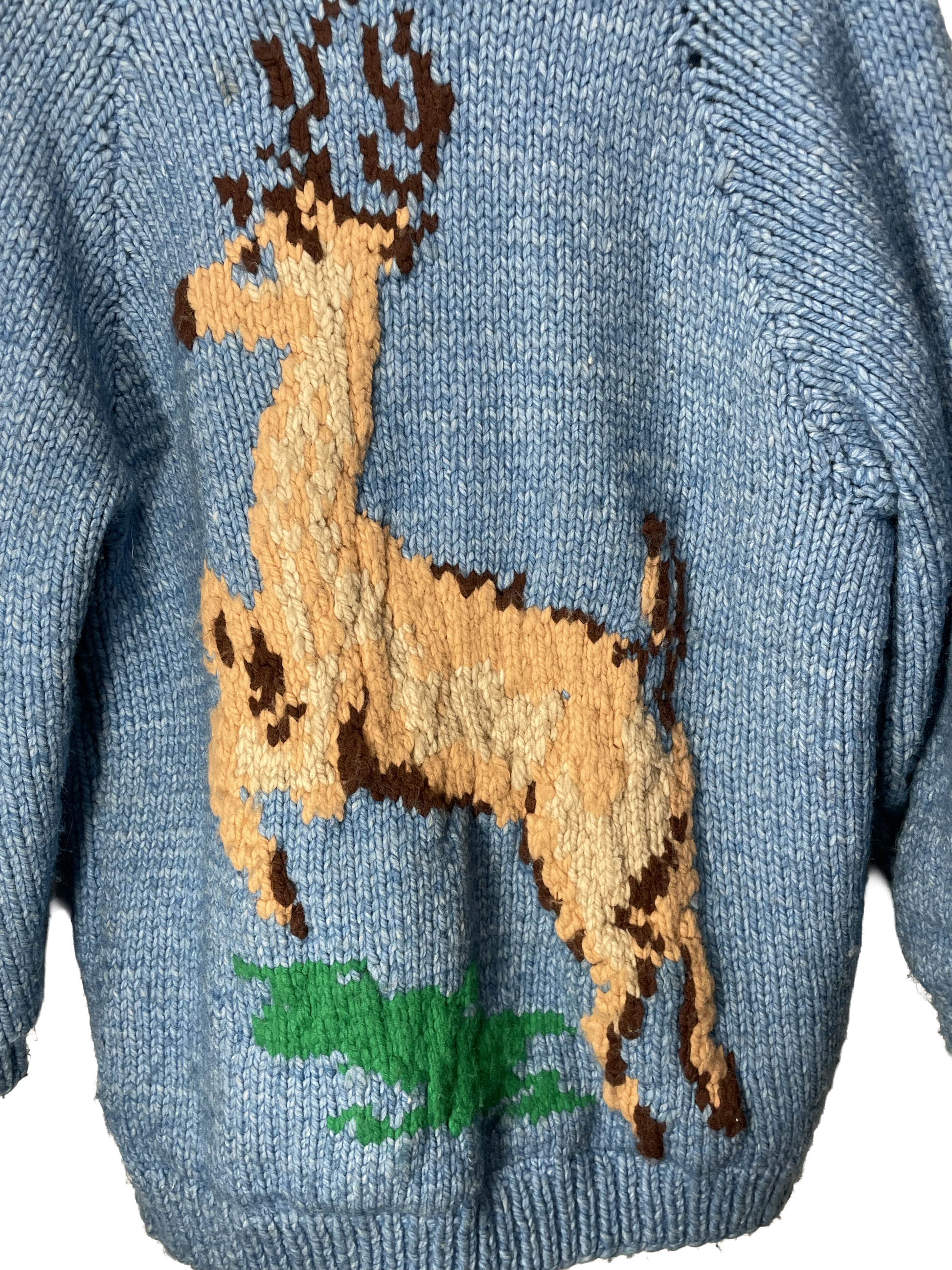 1960s Hand-Knit Wool Light Blue XL Buck Motif Zip Cowichan-Style Cardigan