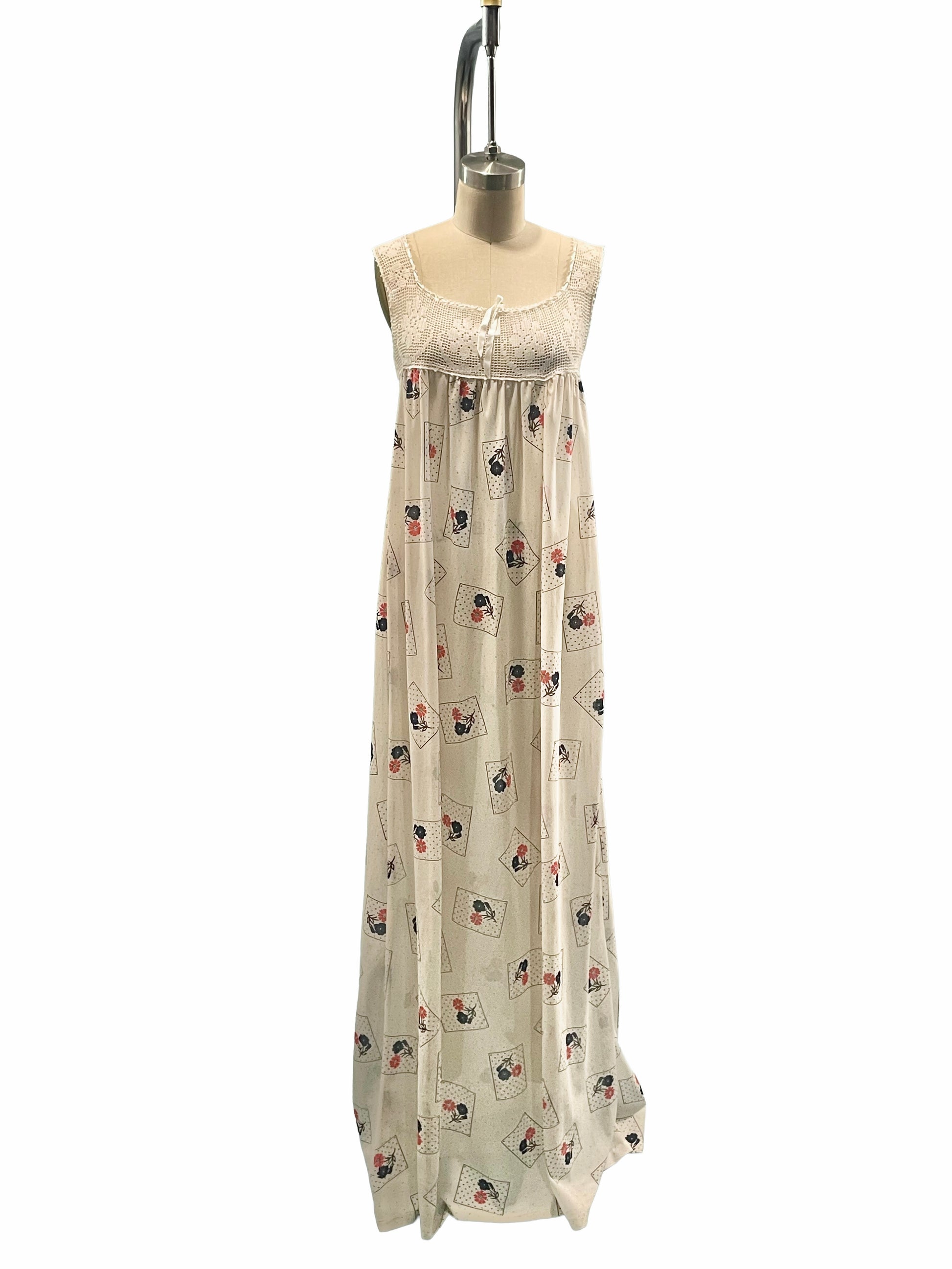 1970s White Crocheted Bodice Nylon Floral Print Boho Maxi Dress