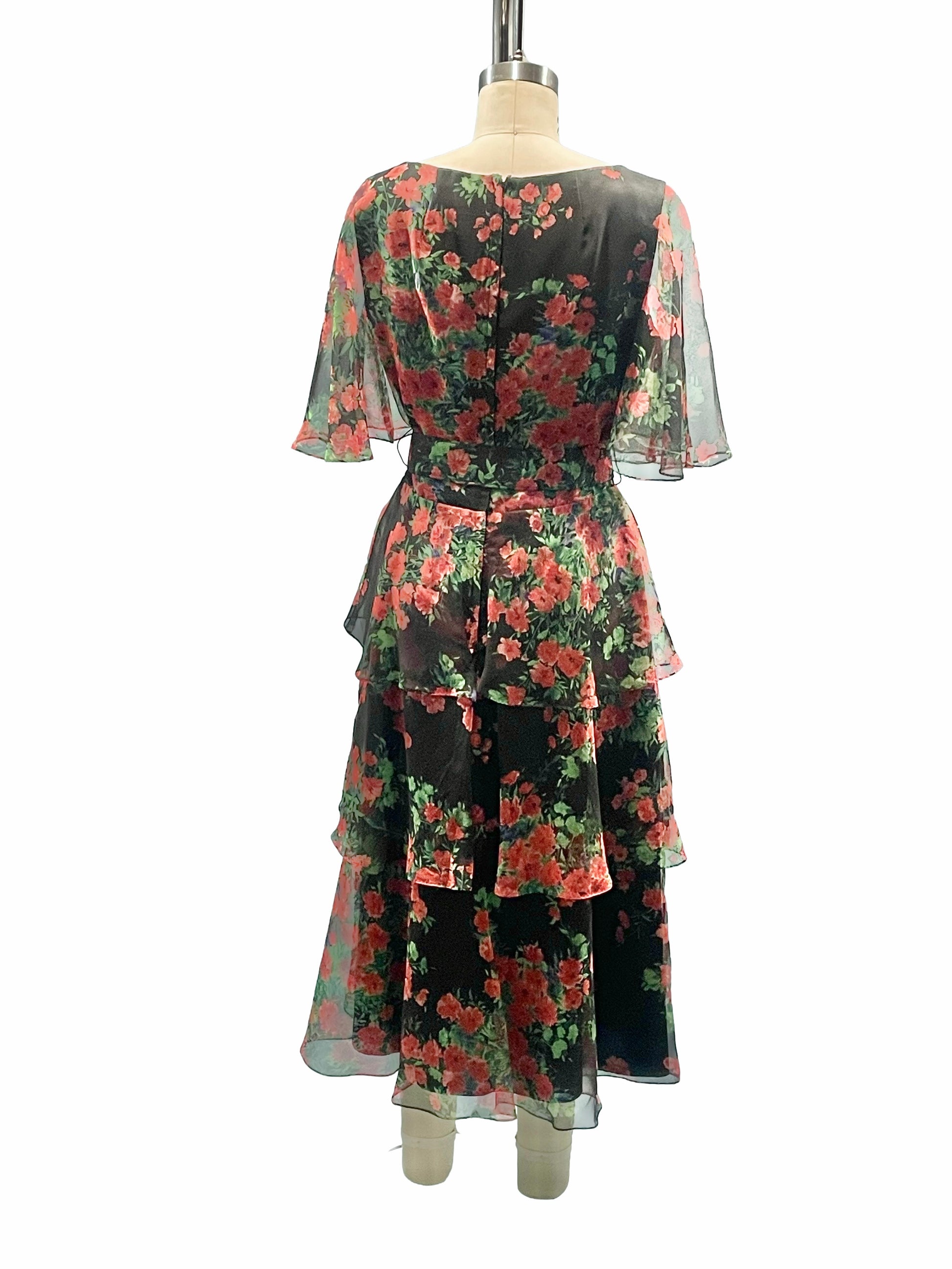 1970s Black Rose Print Miss Elliette Floral Chiffon Overlay Tiered Maxi Dress