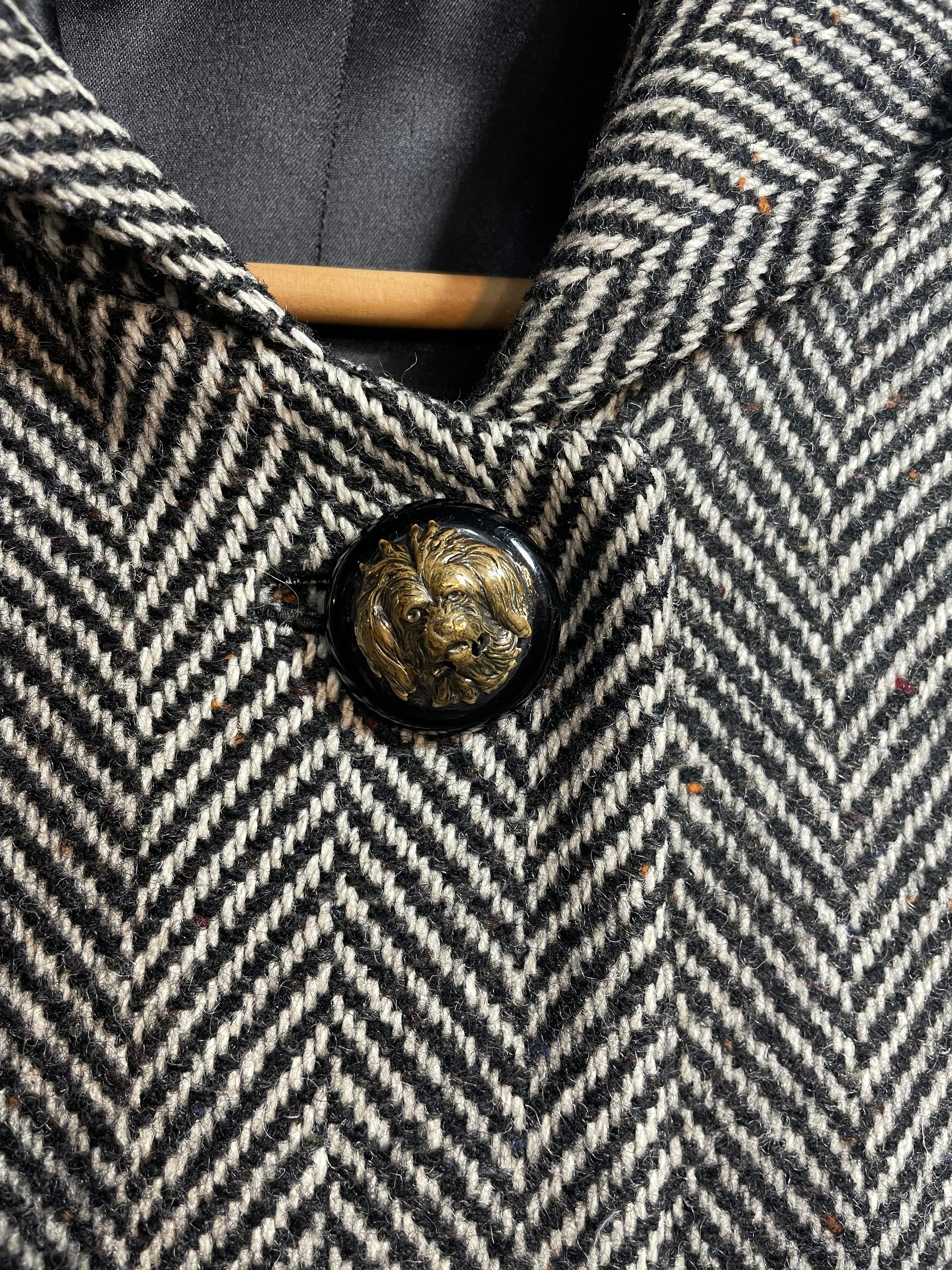 1980s Black White Herringbone Hooded Lion Button Wool Coat