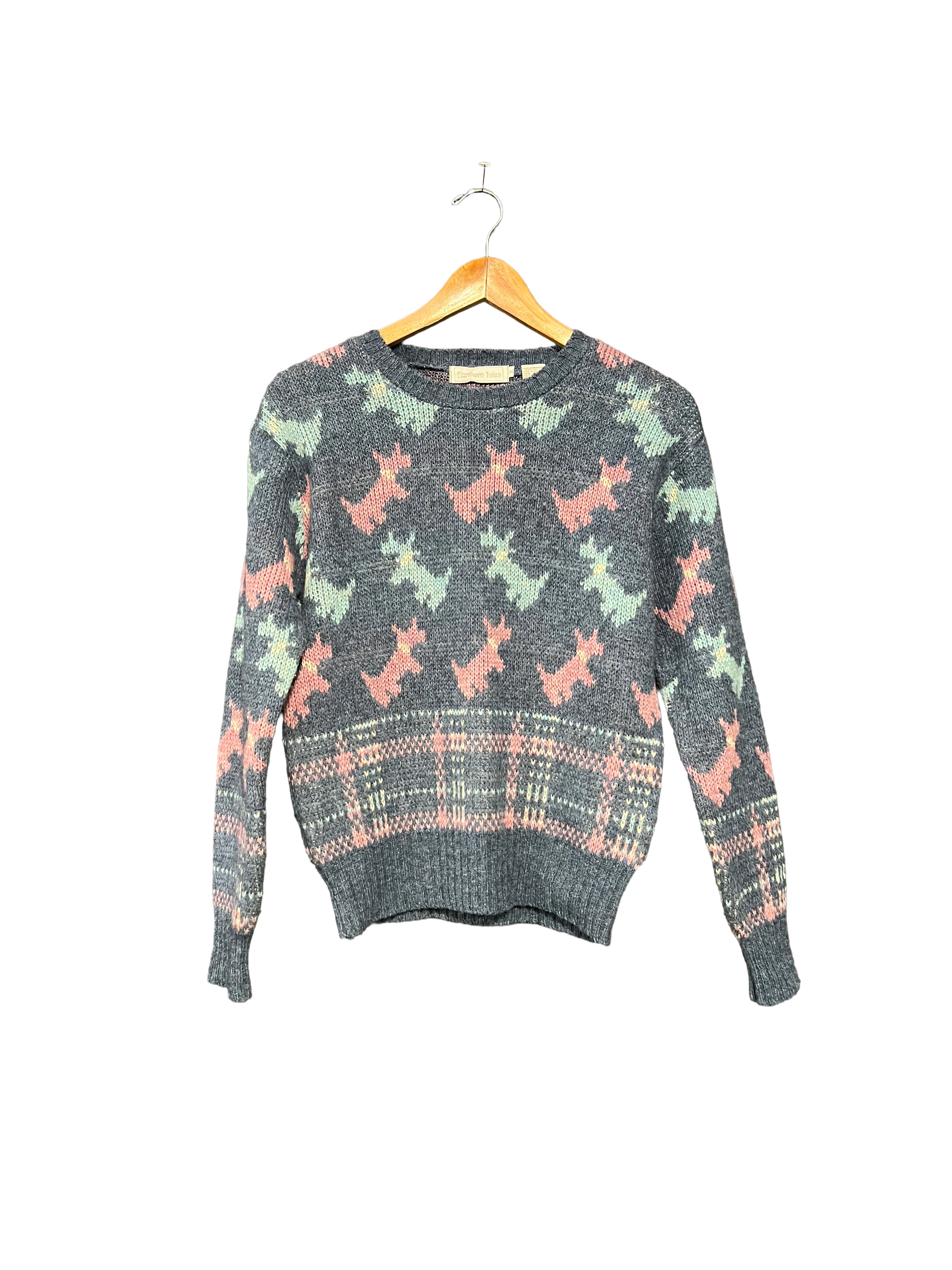 1990s Blue Pink Baby Blue Plaid Scottie Dogs Wool Cropped Sweater